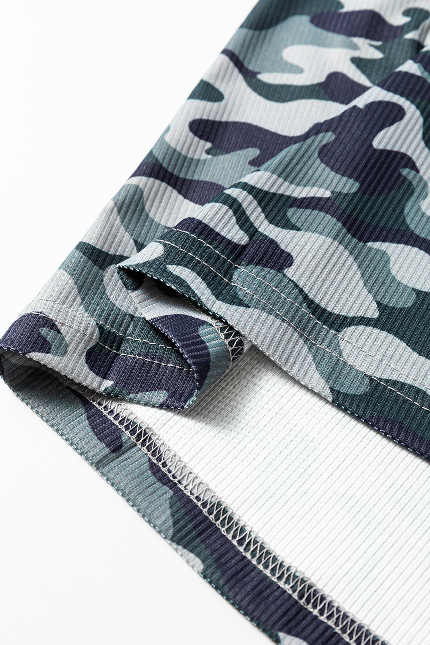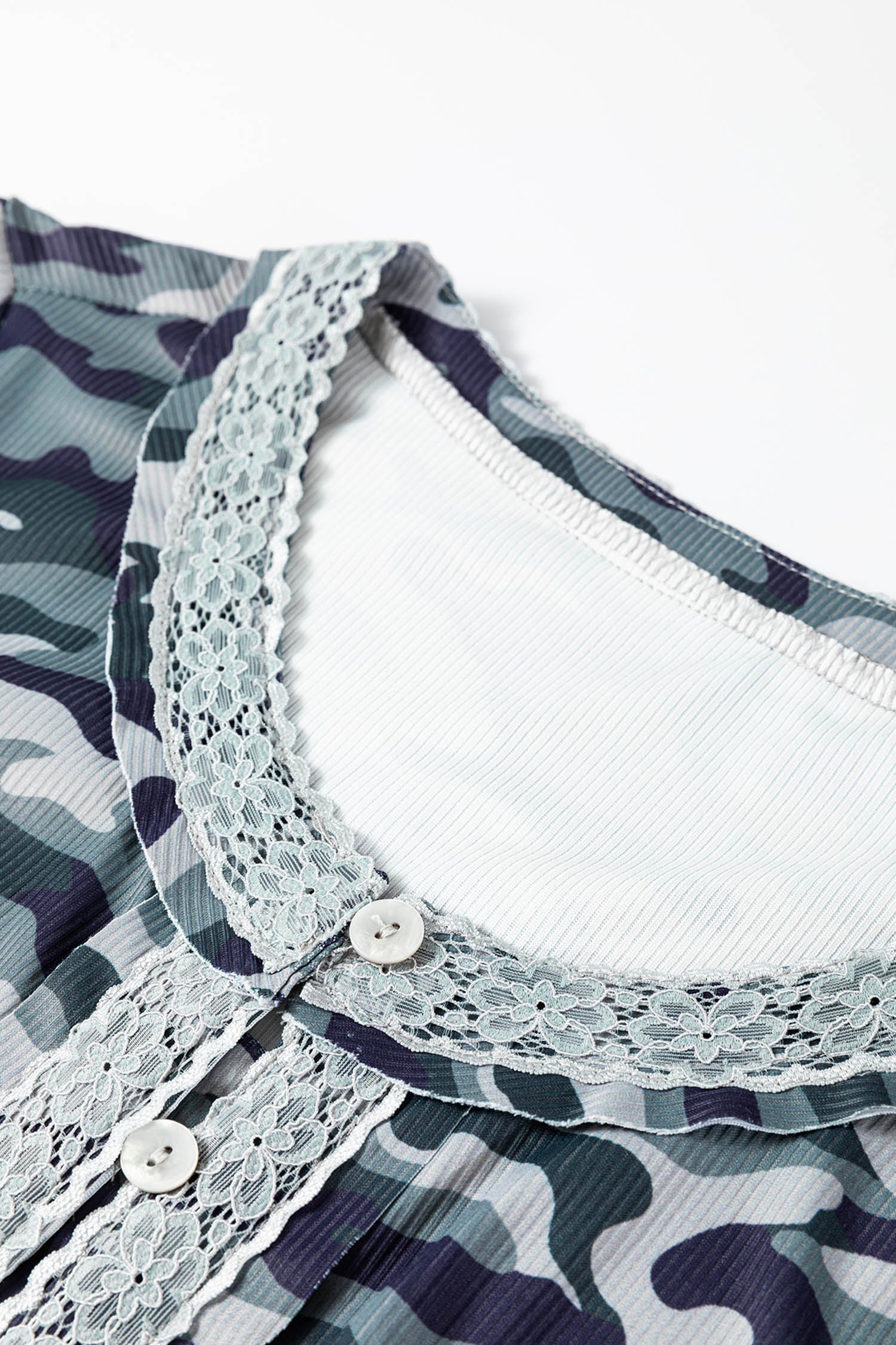 Green Camouflage Print Lace Patchwork Detail Button Long Sleeve Top