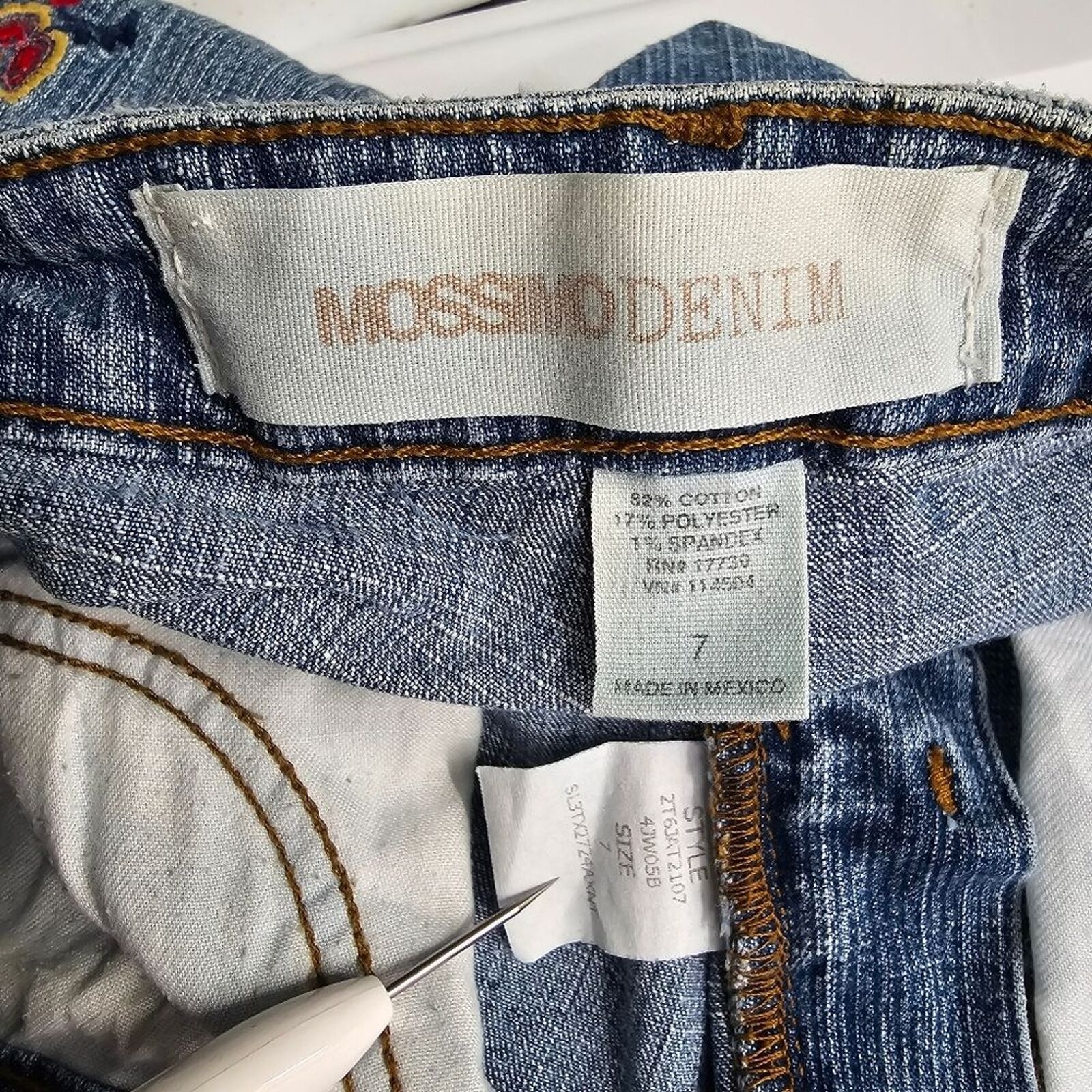 This pant has embroidered flowers on the front and back. Zip up and button fly.