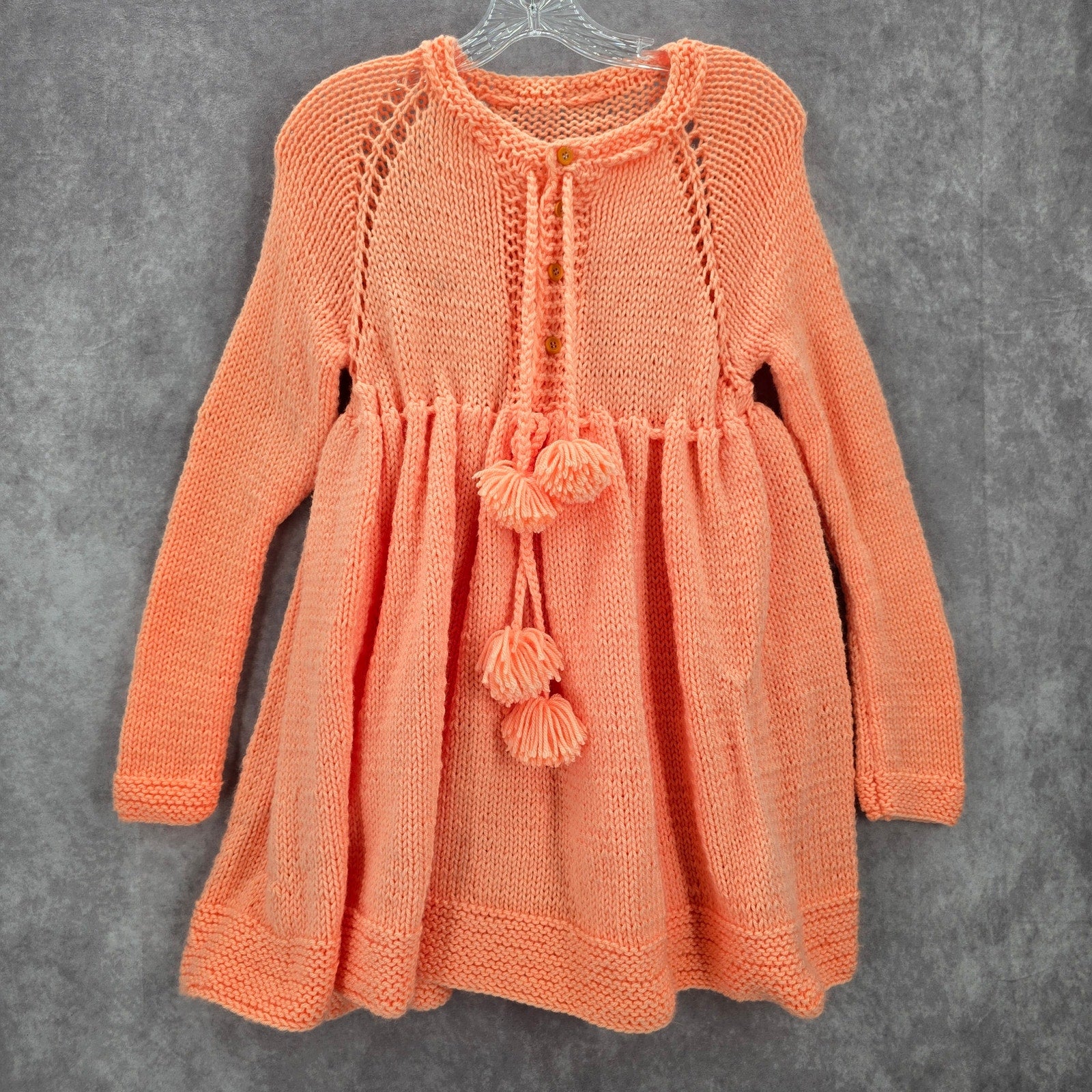 Orange Knit Button Up Tassel Handmade Flare Long Sleeve Girls Dress M Medium